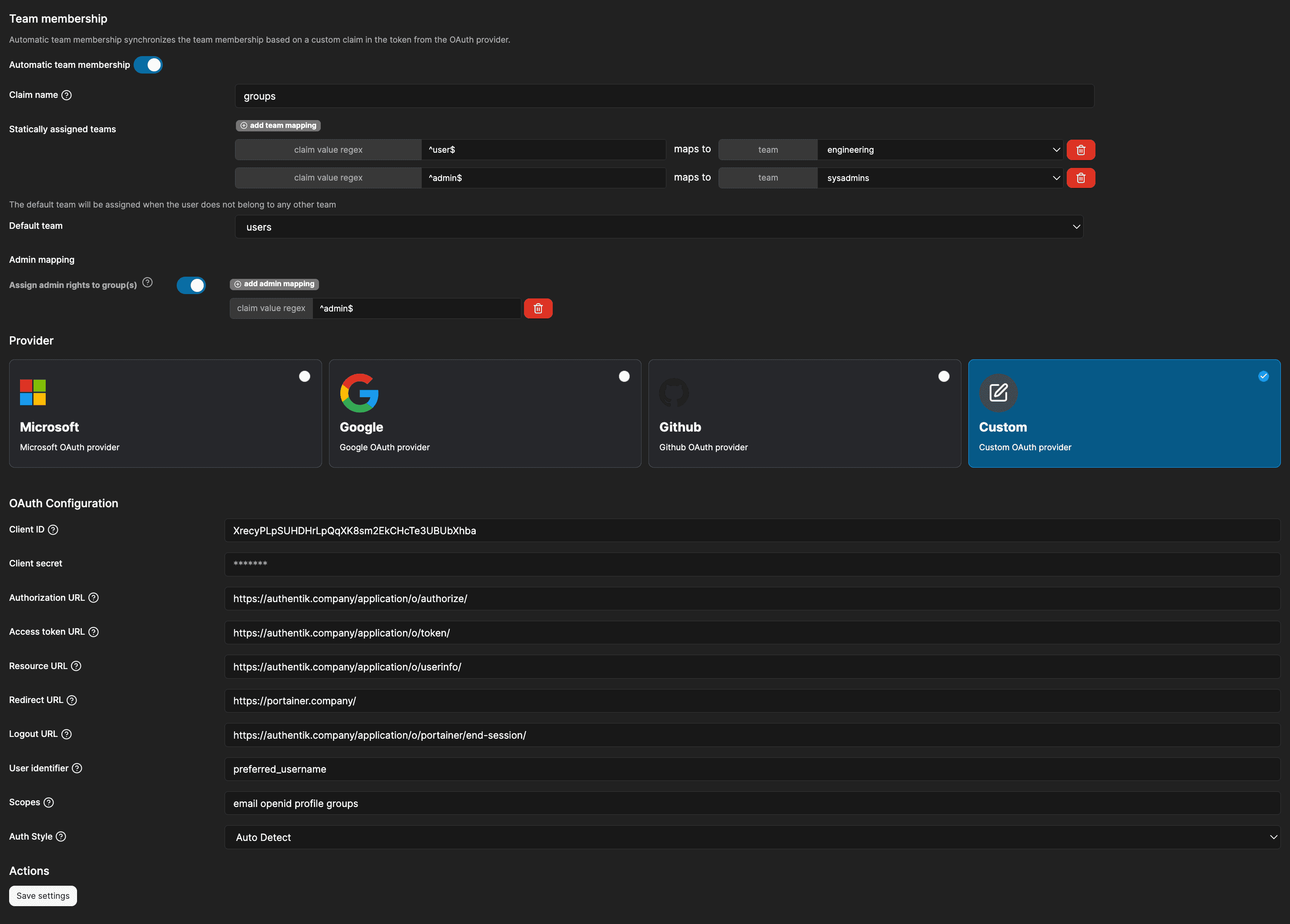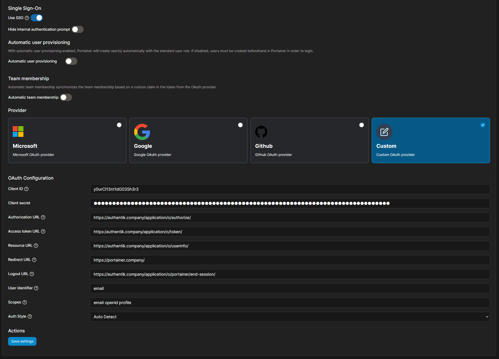 Client IDfrom the authentik provider - Client Secret: The